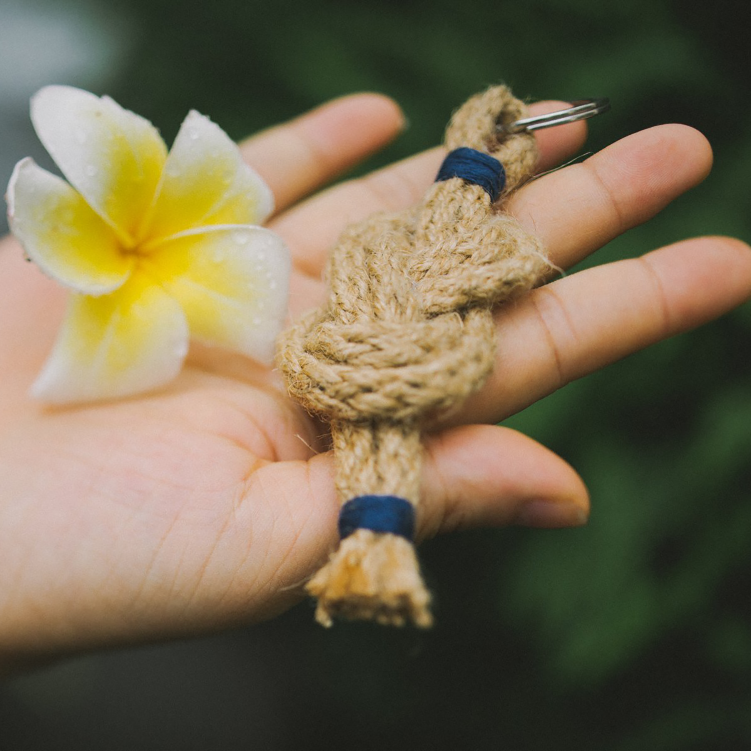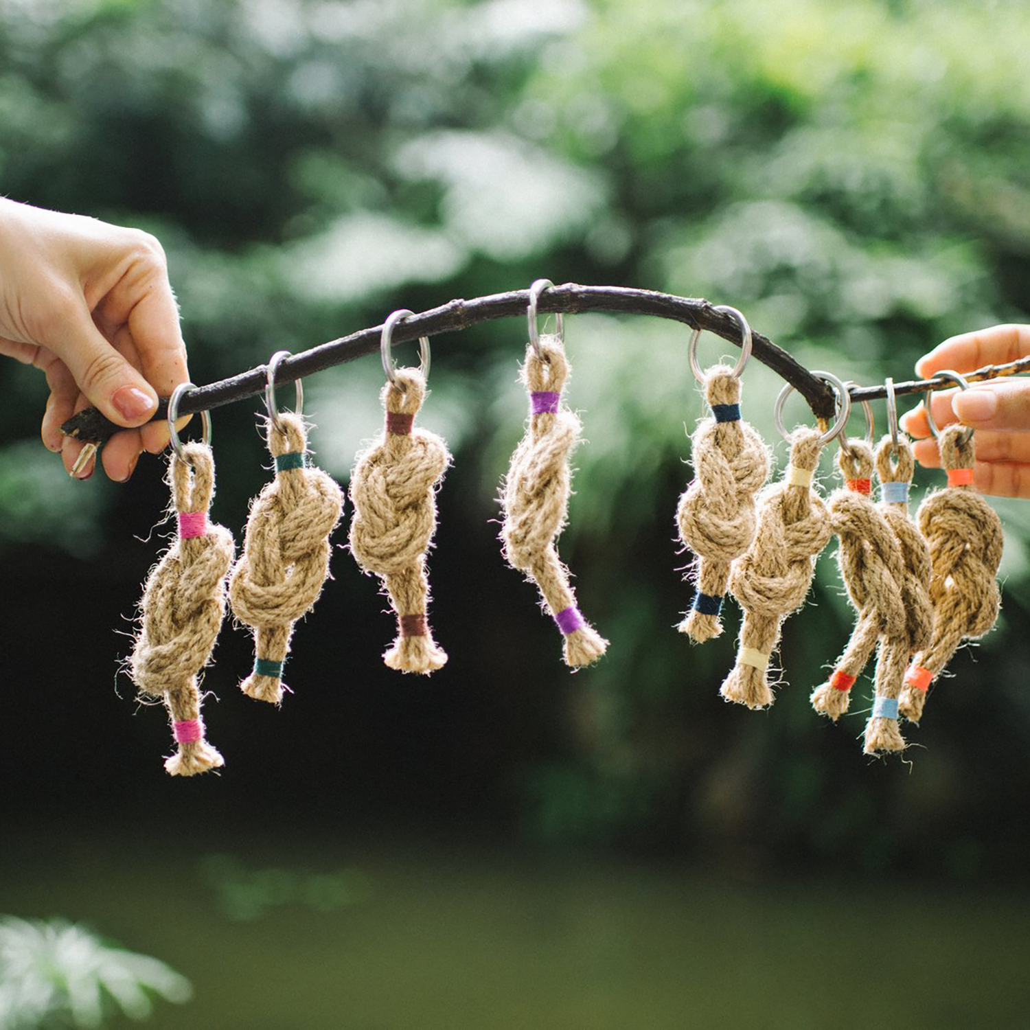 This hand-knotted jute keychain is approximately 4 inches long and comes in many different colors. Please choose your color above.